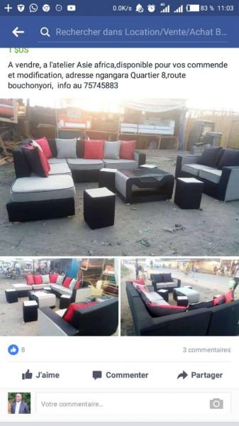 l\'atelier Asie africa vous offre des salons complet,avec contre et coussin ep15cm lavable, contacter 75745883